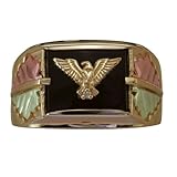 | A handsome men's Black Hills Gold band sports a diamond accented gold eagle mounted on a genuine rectangular black onyx stone.A handsome men's Black Hills Gold band sports a diamond accented gold eagle mounted on a genuine rectangular black onyx stone. A 12k split-colored leaf finishes the look of this masculine design. Features 10k yellow gold band, 12k rose and green gold leaves, geniune onyx (12mm x 10mm), and geniune diamond (.01 total weight). Crafted in the Black Hills of South Dakota, USA. Black Hills Gold item comes with a Certificate of Authenticity and a Lifetime Warranty from the manufacturer. ...Read more |