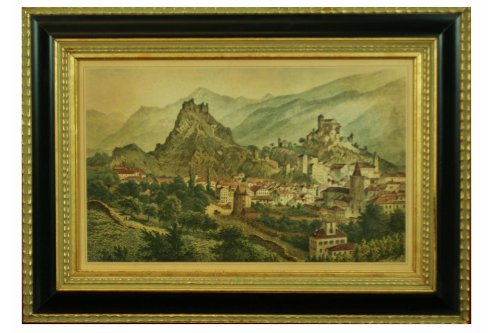 Fine European Mountain Village Landscape Artwork, Set Under Glass in Our Solid Wood Onyx and Gold Embellished Frame Since 1963