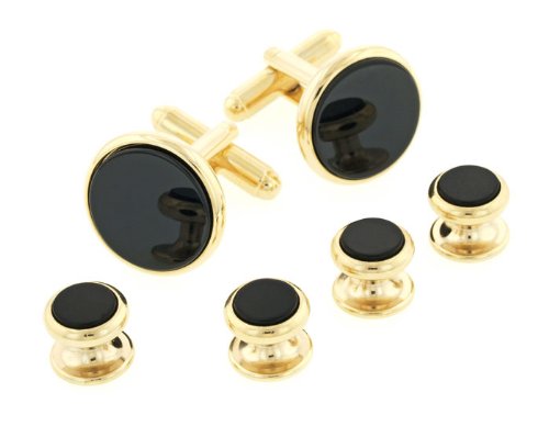 | Yellow gold plated cufflinks and shirt stud set with onyx. Radius edge. T-bar fitting on cufflinks. A classic style. Presentation boxed. Made in the U.S.A ...Read more |