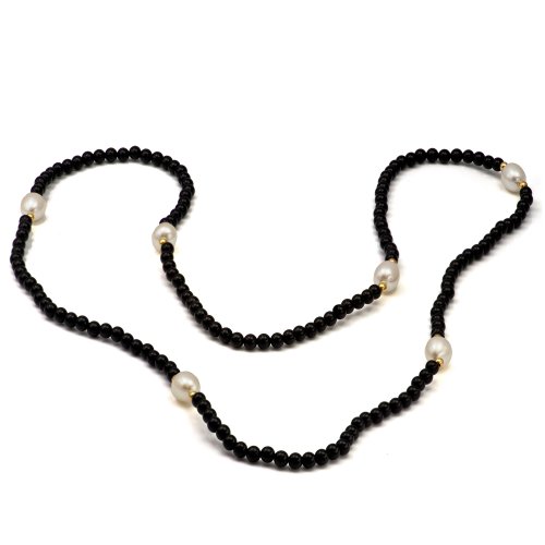 14k Yellow Gold 8-9mm Freshwater Pearl and Black Onyx Endless Necklace 30" Length. -Perfect for Mother's Day Gift