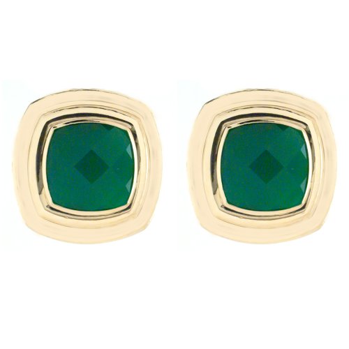 Utilizing a vibrant, transfixing design, these 10k Yellow Gold Cushion Cut Green Onyx Gold Trim Earrings are a dramatic addition to sleek evening dresses. Measuring just less than 3/4 of an inch across, these stunning earrings feature deep green cushion-cut onyx gemstones positioned in their center. Encasing the stones is a lustrous 10k yellow gold frame, elegantly layered to give the earrings an introspective, cross-section effect. Radiant and sophisticated, these striking earrings are sure to catch the eye immediately.